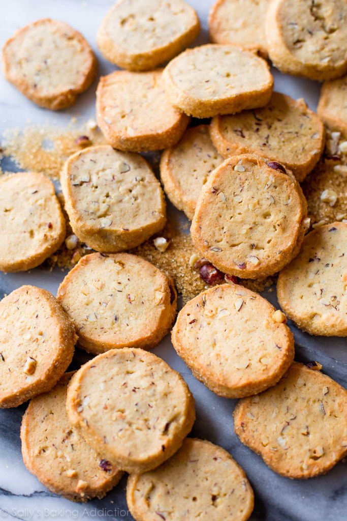 - Put flour, potato flour and baking powder in a bowl. Make a hole in the middle and put sugar and eggs in it . Put butter (not too hard) on top of the flour and knead everything with your hands. Make rolls and put them in the fridge until the dough is hard then slice it.
