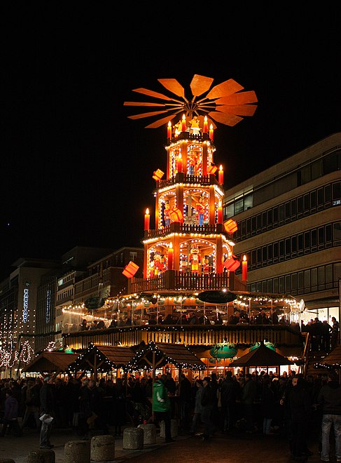 Large replica Christmas pyramids can be found throughout Germany. Some stand as high as 30 feet. Hanover has laid claim to Germany’s tallest replica since 2014 with a 60 foot Christmas tower. German Christmas Pyramid (Weihnachtspyramide)