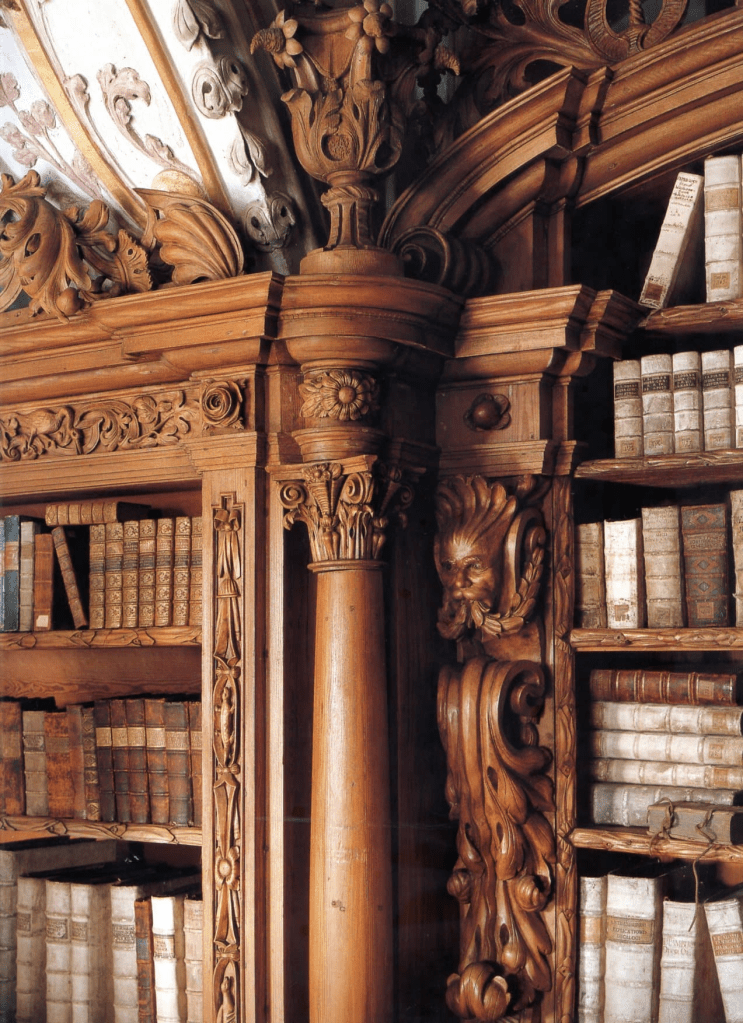 The rich and intricately carved shelves were built in late Baroque and early Rococo style. They hold thousands of volumes bound in white pigskin and dark calfskin. The Ten columns support a balustraded mezzanine with more shelves. Each column is an allegorical figure of a grotesque man bent under their burden of sin such as vanity, ignorance or boastfulness. Waldsassen Abbey, Waldsassen, Germany – SpottingHistory.com